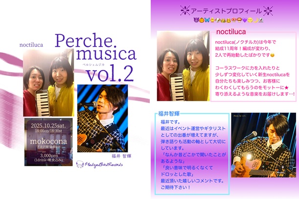 10/25(土)Perche musica(ペルシェムジカ)vol.2 Live開催のお知らせ
